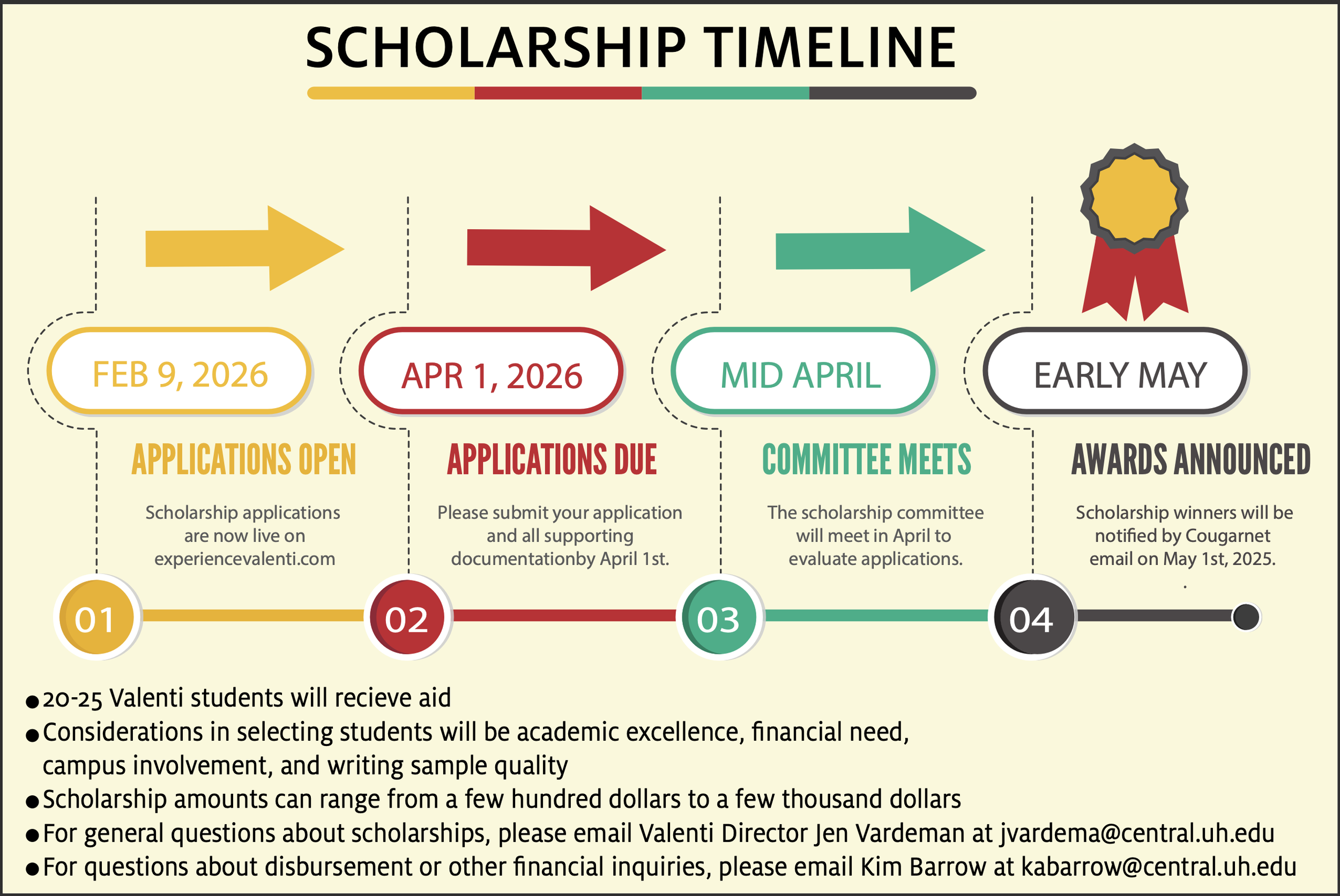 Scholarship applications are open to all communication majors. Students must be enrolled in full-time classes to qualify for Valenti scholarships. The chair of the scholarship committee is Yan Huang and she can be reached at yhuang63@central.uh.edu.